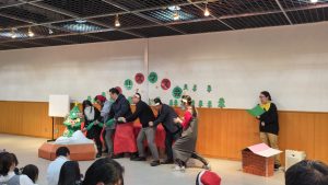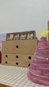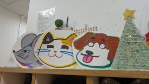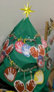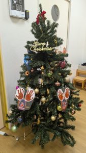 最後に少しご紹介。準備の時から彩ってくれているツリーたち。もみのきツリーもありますが、今年は本省支部の方も手作りで準備してくれたので、子どもたちには手形の雪ダルマとトナカイを作ってもらいました。