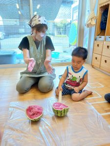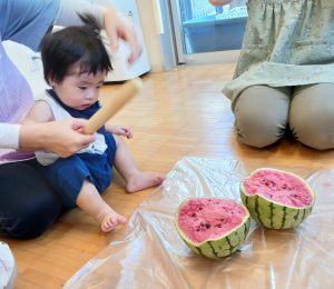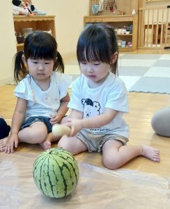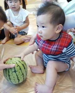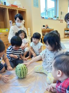 スイカに触れて「つめたーい♪」と笑顔になるお子様たち😊