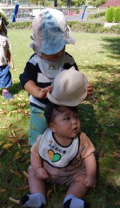 ぼうしがおちてたよ~と拾って、お友だちに被せてくれていました(^^)!