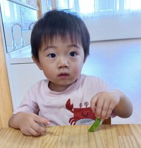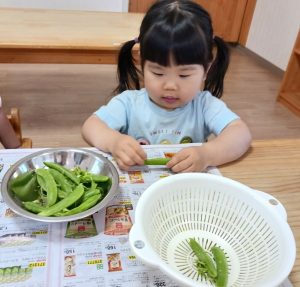 「かたい~」「とれた~」と言いながら、黙々と筋取りを楽しんだ子どもたち。