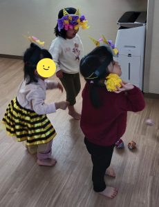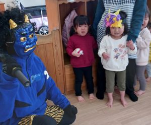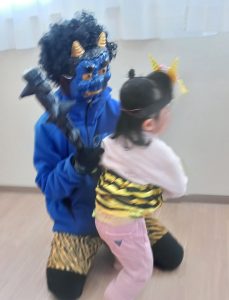 鬼が登場すると大号泣のお子さまたちでしたが、豆を投げ、最後は「ばいばい」と見送ることができました。