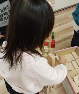 アドバイスし合い工夫して積み木を高く積む姿✨