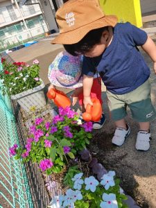 「お花に水をあげようね」と声をかけると、文字どおり花に水をかけてくれるお子さまたちにほっこりです😊