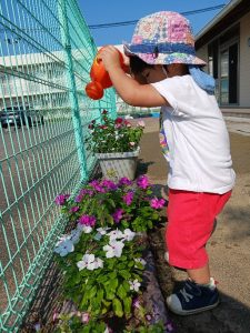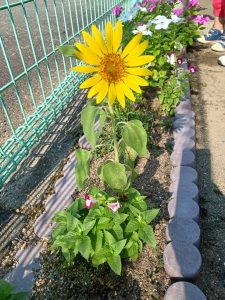 今年の夏は、ひまわり、日々草、トレニア、ペチュニア、松葉牡丹、マリーゴールドが園庭を彩ってくれてます。