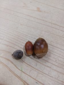 高く澄んだ空、色々な形のどんぐり、オレンジ色に輝く柿、色とりどりの落ち葉🍂