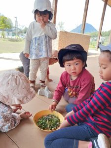 戸外では元気いっぱい体を動かしたり、春の自然に触れながらゆったりと過ごしています。