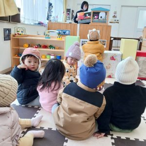 クリスマスの手遊びや紙芝居を見ながら、クリスマスを心待ちにしています。