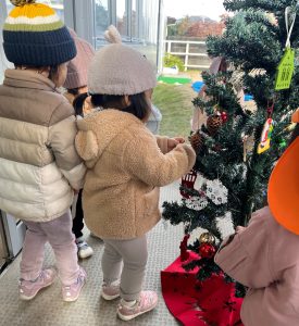 飾りつけをしたツリーを見ながら、「サンタさん早く来ないかな~」「ちゃんと見つけてくれるかな?」とドキドキワクワクしている子どもたちです♪