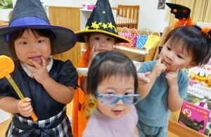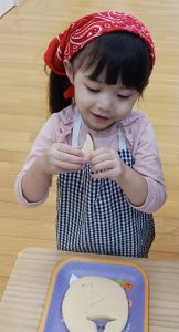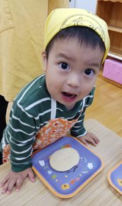 ホットケーキを作り、それをカボチャや、おばけ、コウモリなどハロウィンをモチーフにした型で切り抜き、お皿に飾り付けて楽しみました♪